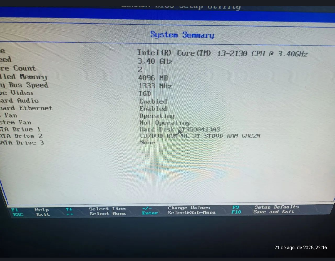Sistema BIOS do Computador: A terceira imagem mostra a tela do BIOS, com informações sobre o processador Intel Core i3-2130 a 3.40 GHz, 4 GB de memória RAM a 1333 MHz, e outros detalhes técnicos do sistema.